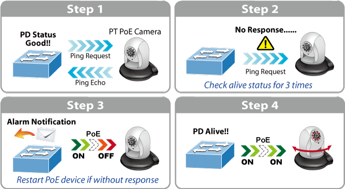 The MGS-6320-8HP2X can be configured to monitor a connected PD status in real time via ping action. Once the PD stops working and it is without response, the MGS-6320-8HP2X will resume the PoE port power and bring the PD back to work. It will greatly enhance the network reliability through the PoE port resetting the PD’s power source, thus reducing administrator management burden.