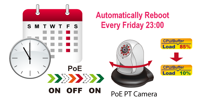 The MGS-6320-8HP2X allows each of the connected PDs to reboot at a specified time each week. Therefore, it will reduce the chance of PD crash resulting from buffer overflow.