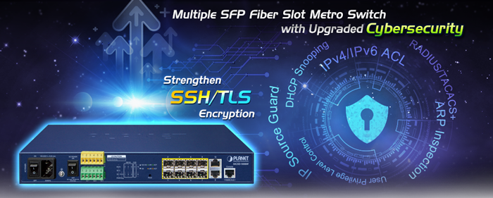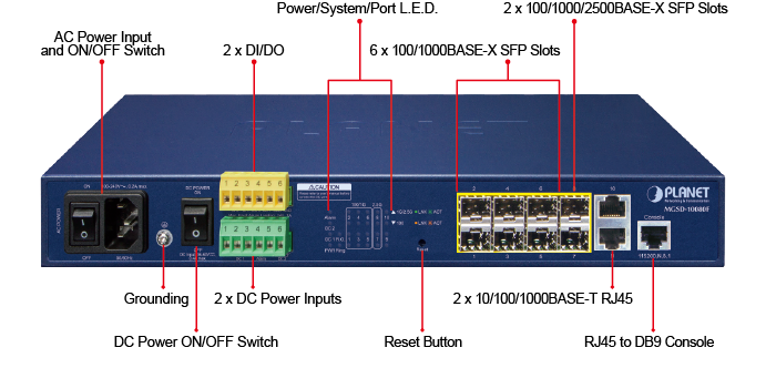 PLANET MGSD-10080F Managed Metro Ethernet Switch is equipped with advanced management functions and provides 6 100/1000Mbps dual speed SFP Fiber ports, 2 100/1000/2500Mbps SFP ports and 2 10/100/1000Mbps TP ports delivered in a rugged strong case. It is capable of providing non-blocking switch fabric and wire-speed throughput as high as 26Gbps in the temperature range from -10 to 60 degrees C without any packet loss and CRC error, which greatly simplify the tasks of upgrading the enterprise LAN for catering to increasing bandwidth demands. The MGSD-10080F is specially designed for service providers to deliver profitable long-distance Ethernet network. The MGSD-10080F adopts “Front Access” design, making the wiring and maintenance of the MGSD-10080F placed in a cabinet very easy for technicians.
