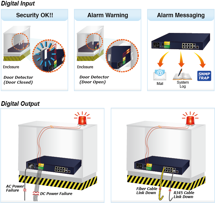 The MGSD-10080F supports Digital Input, and Digital Output on the front panel. The external alarm offers technicians the ability to use Digital Input to detect, and log external device status (such as door intrusion detector) for the alarm as Digital Output could be used to alarm if the MGSD-10080F has port link down, link up or power failure.