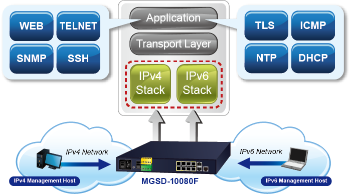 To fulfill the demand for ISP to build the IPv6 (Internet Protocol version 6) network infrastructure speedily, the MGSD-10080F supports both IPv4 and IPv6 management functions. It can work with original IPv4 network structure and also support the new IPv6 network structure. With easy and friendly management interfaces and plenty of management functions included, the MGSD-10080F Metro Ethernet Switch is the best choice for ISP and service providers to build the IPv6 FTTx edge service and for Industries to connect with IPv6 network.