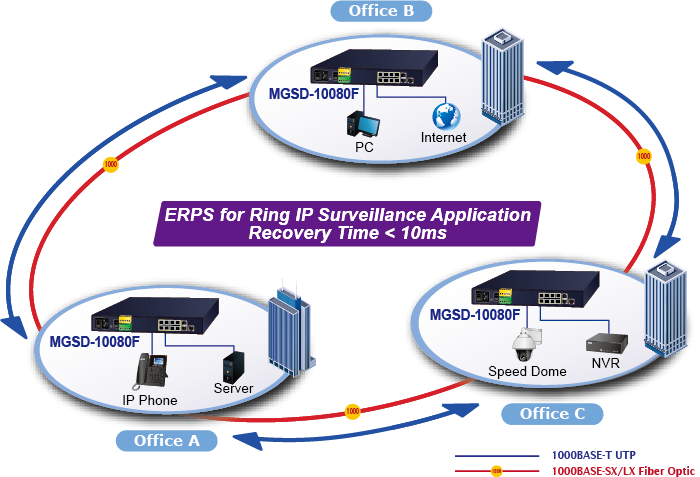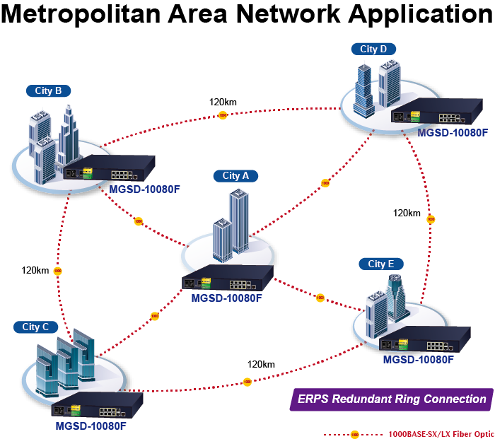 The MGSD-10080F supports redundant ring technology and features strong, rapid self-recovery capability to prevent interruptions and external intrusions. It incorporates advanced ITU-T G.8032 ERPS (Ethernet Ring Protection Switching) technology, Spanning Tree Protocol (802.1s MSTP) into customer’s network to enhance system reliability and uptime in various environments.