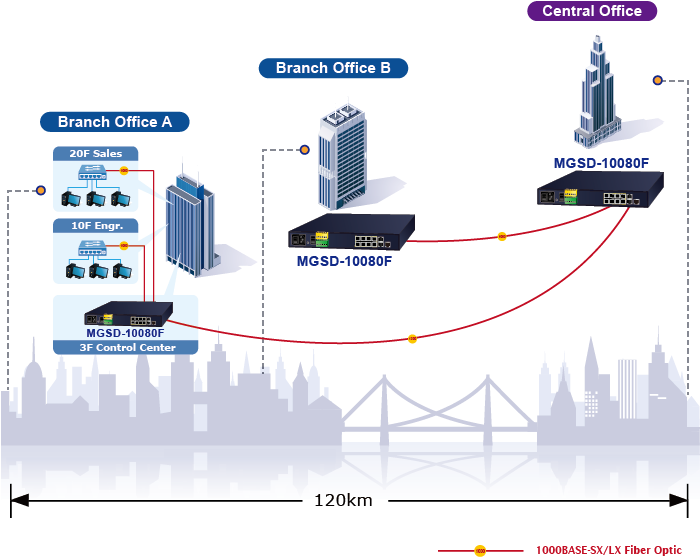 The mini-GBIC slots built in the MGSD-10080F support multi-speed, 100BASE-FX, 1000BASE-SX/LX and 2500BASE-X SFP (Small Form-factor Pluggable) fiber-optic modules, meaning the administrator now can flexibly choose the suitable SFP transceiver according to not only the transmission distance but also the transmission speed required. The distance can be extended from 300 meters to 2 kilometers (multi-mode fiber) and up to above 10/20/40/60/80/120 kilometers (single-mode fiber or WDM fiber). They are well suited for applications within the enterprise data centers and distributions.