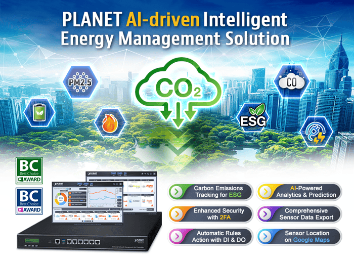 PLANET NMS-AIoT is an AI-powered AIoT application server that centrally manages and analyzes data from over 3,000 IoT sensors. By integrating LoRaWAN, Wi-Fi HaLow, and AI-driven energy analytics, the platform delivers real-time monitoring, intelligent anomaly detection, and predictive energy insights—helping enterprises optimize energy usage and achieve sustainability goals.