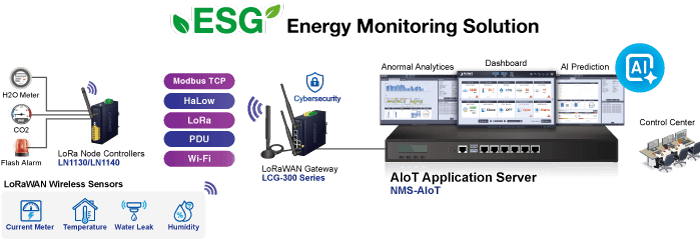 The NMS-AIoT platform integrates multiple communication protocols, including LoRa, Wi-Fi HaLow, Modbus, and PDU, enabling unified management of wired and wireless IoT devices across enterprise infrastructures. With AI-powered analytics, sensor data is transformed into predictive insights for intelligent, multi-site energy analysis.