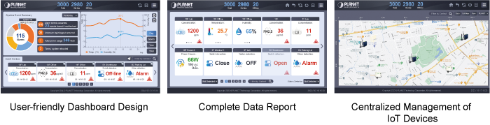 • product_editor_4421_tab_content: <ul> <li>A unified platform integrating LoRa, Wi-Fi HaLow, Modbus and more</li> <li>ESG energy management reporting with real-time sensor data analysis and carbon footprint reduction</li> <li>Supports integration with versatile IoT devices.</li> <li>Intuitive smart dashboard</li> <li>Real-time environmental monitoring and analysis</li> <li>Precise device location mapping</li> <li>24/7 real-time event notifications</li> <li>Early error detection and anomaly resolution</li> <li>Map-based sensor location management</li> <li>Enhanced security with two factor authentication</li> <li>Embedded hardware controller for easy setup</li> <li>Easy installation for non-technical personnel</li> <li>Support for future software upgrades</li> <li>Support for private and PLANET cloud platforms</li> </ul>