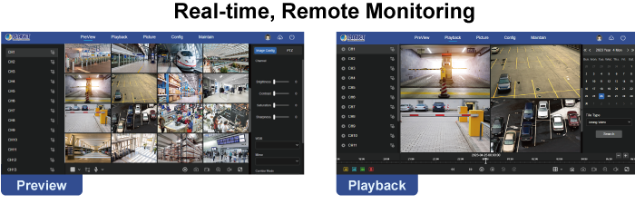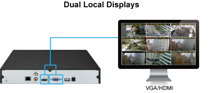 The NVR-1600 comes with HDMI and VGA video output interfaces for dual local display. It can be connected to a 4K HDMI monitor and 1080p VGA monitor separately, where live viewing contents or playback contents can be displayed simultaneously. With the dual local display function, users can monitor locally with high flexibility in a different display resolution, thus eliminating the need for a separate PC to view video from the unit. Besides, the NVR can also be operated with the USB mouse to configure and monitor all the systems easily.