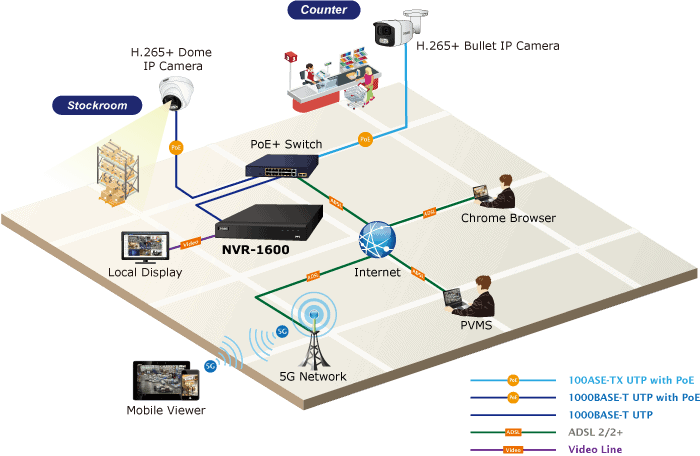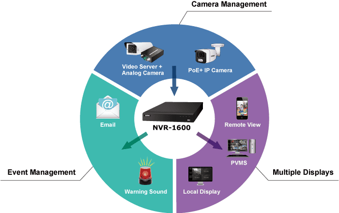 Up to 16 IP cameras can be connected to the NVR-1600 via a connected IP network. With the NVR-1600, it delivers high-performance video recordings and smooth playbacks of multiple megapixel cameras. Users can view remote surveillance in real time and play back recorded videos via the Web browser or the bundled PVMS (Professional Video/Central Management Software).