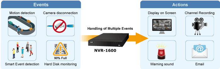 The NVR-1600 can be used as a control center to control and monitor up to 16 connected network cameras locally or remotely, perfectly designed for IP surveillance applications, with one internal SATA hard disks drawers interface and video files kept in the NVR for a long period of time. Once the NVR-1600, armed with complete surveillance equipment, detects any suspicious events, you will be alerted via built-in buzzer, email notification and on-screen alerts.