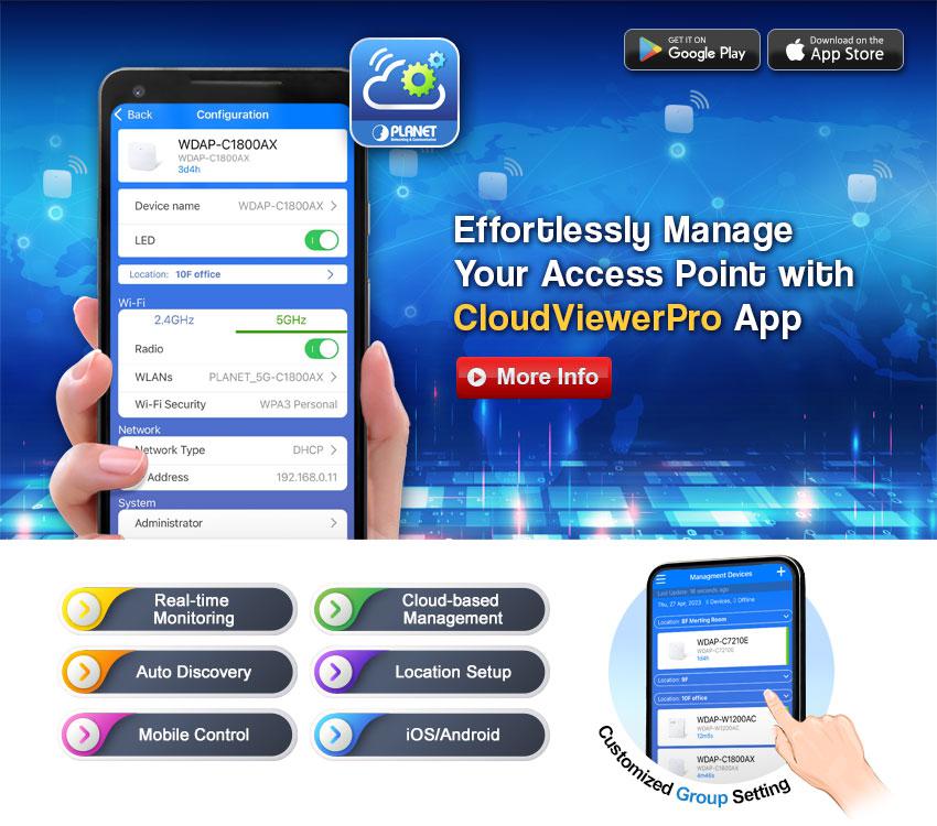 PLANET CloudViewerPro is an Intelligent App that monitors and controls your wireless AP network in the cloud. With cloud network, it makes data and services available from anywhere with an Internet connection. With PLANET CloudViewerPro, your wireless network status can be configured in real time anytime, anywhere via your mobile phone or tablet. User can easily check Wi-Fi network status and device information from the cloud to reduce management costs.