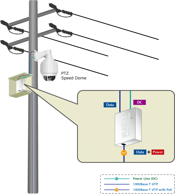 Due to the capability of IEEE 802.3at PoE Plus standard, the POE-161S only can be powered by the IEEE 802.3at Power over Ethernet Plus injector devices like the POE-161/POE-163/POE-164, IEEE 802.3at Power over Ethernet Plus Switch/Media Converter and transform non-PoE equipment to IEEE 802.3at PoE application. For a place which is hard to find the power inlet, the IEEE 802.3at Power over Ethernet Plus injector devices and the POE-161S operate as a pair to provide the easiest way to power your Ethernet devices that need high power input, such as PTZ (Pan, Tilt & Zoom) network cameras, PTZ speed dome cameras, color touch-screen Voice over IP (VoIP) telephones, and multi-channel wireless LAN access points which are installed on the top of the building or used in enterprise office or home.