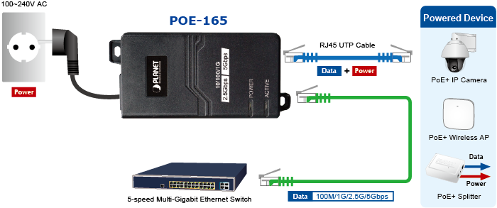 PLANET POE-165 is a Single-Port, 802.3at Power over Ethernet Injector with a maximum of up to 30 watts of power output over Ethernet cables. It is also equipped with two 10M/100M/1G/2.5G/5GBASE-T RJ45 copper interfaces to handle extremely large amounts of data transmission.
