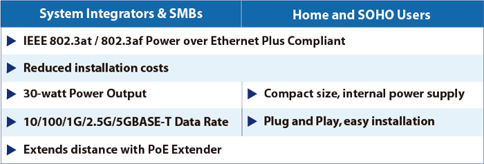 As PoE applications have expanded to home users from the IT industry, PLANET has developed a new Single-port PoE+ Injector which meets the requirements of both the IT industry and home users for high wattage output and easy installation, respectively.