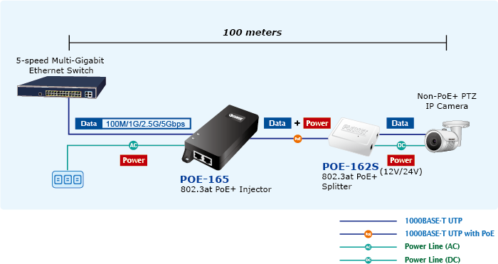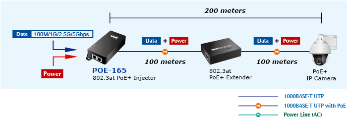 The POE-165 delivers the Ethernet digital data with DC power over the twisted-pair cables as a 30-watt Power over Ethernet Injector, and the connected ultra Power over Ethernet splitter, the POE-161S/162S, will separate the digital data and the power into three optional outputs (5V/12V/24V DC) with distance up to 100 meters.