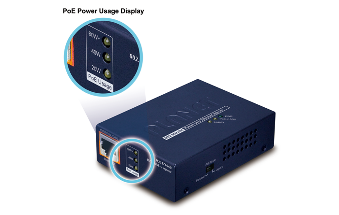 Moreover, the POE-171A-60 helps users to monitor the current status of PoE power usage easily and efficiently via its advanced LED indication. “PoE Power Usage” displayed on the front panel of the POE-171A-60 has three LED indicators of different power usages. Via the power usage LED, the POE-171A-60 enables the administrator to monitor the status of the power usage of the connected PDs in real time.