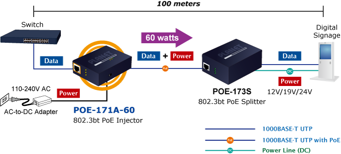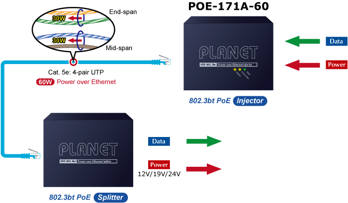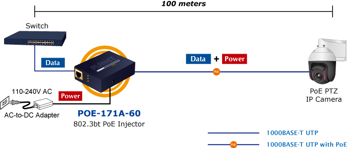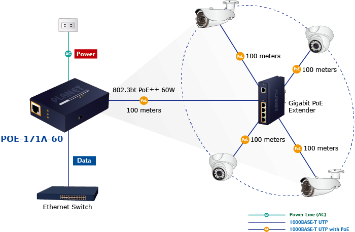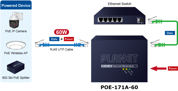 • product_editor_4418_tab_content: <strong><span style="font-size: 14px;">Installation of 802.3bt PoE Injector </span></strong> <span style="font-size: 14px;">Due to the backward capability of IEEE 802.3af/at PoE standard, the POE-171A-60 can directly connect with any IEEE 802.3af/at end-nodes, such as PTZ (Pan, Tilt & Zoom) speed dome IP cameras, color touch-screen Voice over IP (VoIP) telephones, and multi-channel wireless LAN access points.</span>   <img style="display: block; margin-left: auto; margin-right: auto;" src="https://www.planet.com.sa/planet-storage/2025/01/POE-171A-60v3-4.png" alt="" width="700" height="298" />   <span style="font-size: 14px;"><strong>Installation of 802.3bt PoE Injector and Splitter</strong> </span> <span style="font-size: 14px;">For a place which is hard to find the power inlet, the POE-171A-60 and POE-173S operate as a pair to provide the easiest way to power your Ethernet devices which need high power input, such as PTZ network cameras, PTZ speed dome cameras, color touch-screen Voice over IP (VoIP) telephones, and multi-channel wireless LAN access points installed on the top of the building or used in enterprise office or home.</span>   <img style="display: block; margin-left: auto; margin-right: auto;" src="https://www.planet.com.sa/planet-storage/2025/01/POE-171A-60v3-5.png" alt="" width="700" height="317" />   <strong><span style="font-size: 14px;">Extended Installation of IEEE 802.3bt Injector and PoE Network</span></strong> <span style="font-size: 14px;">Is 100-meter cable long enough for a wide range of IP surveillance deployments? The answer is certainly not. To achieve the benefits of IP surveillance and also the long-distance IP camera distribution, the POE-171A-60 and PLANET PoE Extender, the IPOE-E174, can be a quick and cost-effective option. In the simplest application, the PoE Extender enables a PoE IP camera to be installed up to 200 meters away from the POE-171A-60. The POE-171A-60 delivers PoE power over the first 100 meters to the PoE Extender over UTP cables, and then the PoE Extender forwards the Ethernet data and remaining PoE power to the remote PoE IP cameras. </span>   <img style="display: block; margin-left: auto; margin-right: auto;" src="https://www.planet.com.sa/planet-storage/2025/01/POE-171A-60v4_POE-171A-95v4-1.png" alt="" width="700" height="458" />