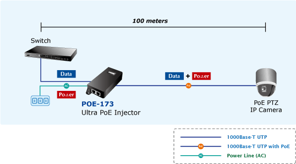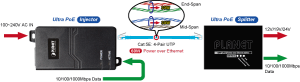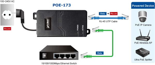 PLANET POE-173 Ultra Power over Ethernet Injector provides a maximum of up to 60-watt power and high speed Ethernet data connection anywhere in your network infrastructure. PLANET Ultra Power over Ethernet solution contains two brand-new products: