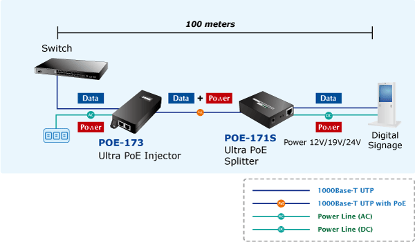 The POE-173 delivers the Ethernet digital data with DC 50V power over the twisted pair cables as a 60-watt Power over Ethernet Injector, and the connected Ultra Power over Ethernet splitter – the POE-171S – will separate the digital data and the power into three optional outputs (12V / 19V / 24V DC) with distance up to 100 meters.