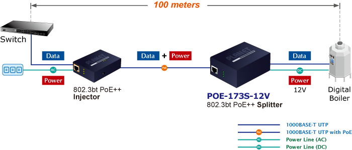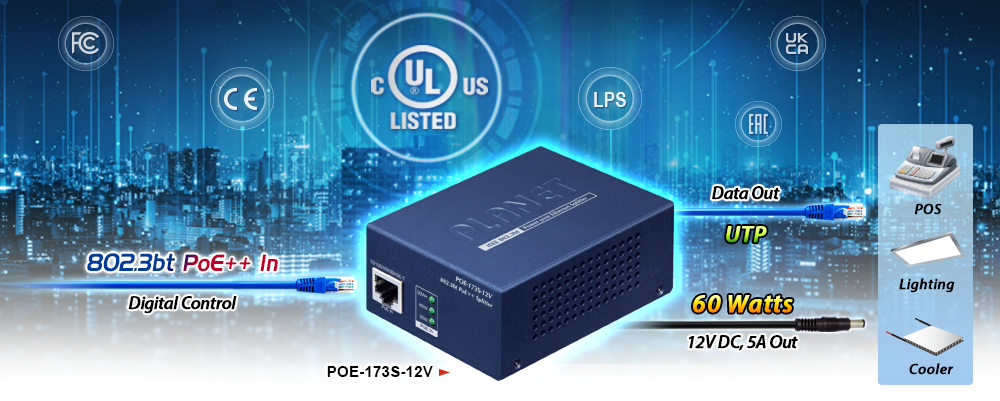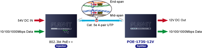 PLANET POE-173S-12V Gigabit 802.3bt Power over Ethernet splitter, which delivers the Ethernet digital data and PoE power from an 802.3bt type-4 PoE++ PSE (power source equipment) over an UTP cable, comes with a DC 12V output, enabling to deliver a maximum of 60-watt power output to a non-PoE powered Ethernet device. It supports passive 10/100/1000Mbps Ethernet connection and distance up to 100 meters.