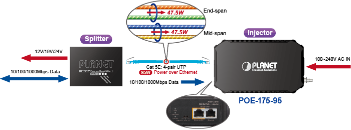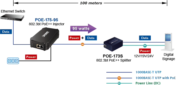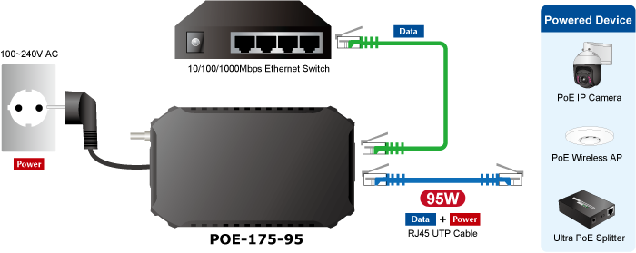 The POE-175-95 delivers the Ethernet digital data with 54V DC power over the twisted-pair cables as a 95-watt Power over Ethernet Injector, and the connected ultra Power over Ethernet splitter, the POE-173S, will separate the digital data and the power into three optional outputs (12V/19V/24V DC) with distance up to 100 meters.