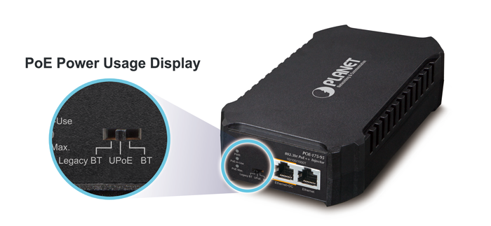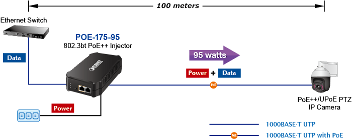 PLANET POE-175-95 is a 1-Port 802.3bt Power over Ethernet Injector with a maximum of up to 95 watts of power output over Ethernet cables.