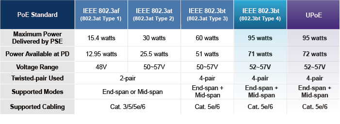 Instead of delivering power over 2-pair twisted UTP – be it end-span (Pins 1,2,3 and 6) or mid-span (Pins 4,5,7 and 8), it provides the capability to source up to 95 watts of power by using all the four pairs of standard Cat.5e/Cat. 6 Ethernet cabling.