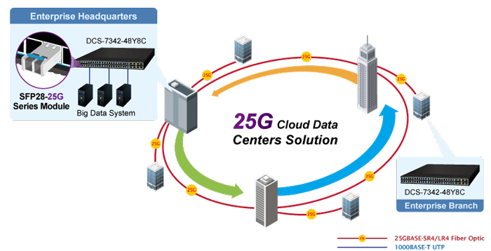 PLANET SFP28 25G fiber optic transceiver series is designed to work with PLANET products with 25G SFP28 interfaces. It provides a high-performance 25Gbps Ethernet network for enterprises, telecoms and ISPs. It is suitable for PLANET DCS-7342-48Y8C Layer 3 Managed Data Center Switch. The SFP28 series is also well applicable for data center cloud computing. The deployment distance can be extended from 100 meters (multi-mode, LC) to up to 10 kilometers (single-mode, LC).