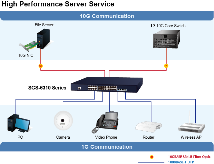 The SGS-6310 series provides high-density performance, Layer 3 IPv4/IPv6 static routing, RIP and OSPF dynamic routing capability, ERPS ring, abundant L2/L4 switching engine and virtual switch stacking technology to fulfill the need of heavy transmission of all applications. It gives the enterprises, service providers and campuses flexible control over port density, uplinks and switch stack performance at an affordable price beyond value.