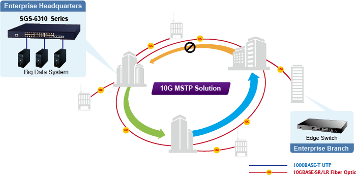 Two of the 10G SFP+ ports can be configured to connect several SGS-6310 series for building a virtually logical facility. The stackable SGS-6310 series, suitable for the enterprises, service providers and telecoms, provides high port density, large uplink bandwidth and high stacking performance, thus giving great flexibility for different application requirements. The SGS-6310 series can connect as a ring for redundancy and ensures that data integrity is retained even if one switch in the stack fails. You can even hot-swap switches without disrupting the network operations.