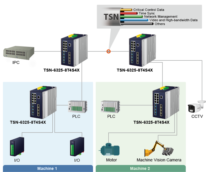 PLANET TSN-6325-8T4S4X is a brand-new Industrial-grade Layer 3 Time-Sensitive Networking (TSN) Managed Ethernet Switch which features 8 10/100/1000BASE-T RJ45 ports, 4 1G/2.5GBASE-X SFP ports and 4 10GBASE-SR/LR SFP+ ports and Layer 3 IP routing in a rugged IP30 metal case for stable operation in heavy environments, address all levels of the industrial automation network, from the field bus to the factory backbone. And it guarantees end-to-end transmission of high-priority traffic with extremely low latency.