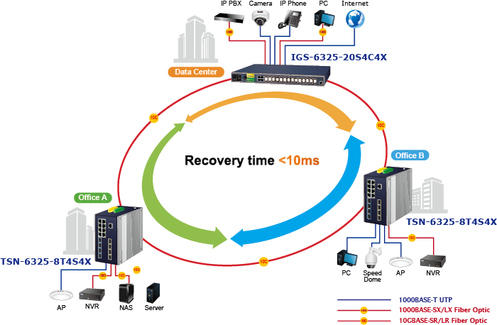 • product_editor_4418_tab_content: <strong>High Availability Mesh Networking Solution for Big Data System</strong> To improve the technology of Optical Fiber Ethernet with highly-flexible, highly-extendable and easy-to-install features, the TSN-6325-8T4S4X offers up to <strong>116Gbps</strong> data exchange speed via Optical Fiber interface and the transmission distance can be extended to 120km. The TSN-6325-8T4S4X features strong, rapid, self-recovery capability to prevent interruptions and external intrusions. It incorporates<strong> ITU-T G.8032 ERPS (Ethernet Ring Protection Switching)</strong> into customer’s automation network to enhance system reliability and uptime. The IGS-6325 DIN-rail series is the ideal solution for data centers, service providers and telecoms to build redundant connection and establish high bandwidth for <strong>Big Data</strong> server farm. <img style="display: block; margin-left: auto; margin-right: auto;" src="https://www.planet.com.sa/planet-storage/2025/01/TSN-6325-8T4S4X-10.png" alt="" width="700" height="458" /> <strong>Layer 3 VLAN Routing </strong> With the built-in, robust Layer 3 routing protocols, the TSN-6325-8T4S4X ensures reliable routing between VLANs and network segments. The routing protocols can be applied by VLAN interface with up to 128 routing entries. The TSN-6325-8T4S4X, certainly an ideal solution for industries, offers greater security, control and bandwidth conservation, and high-speed uplink.