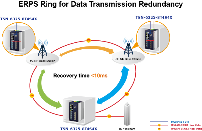 The TSN-6325-8T4S4X supports redundant ring technology and features strong, rapid self-recovery capability to prevent interruptions and external intrusions. It incorporates advanced ITU-T G.8032 ERPS (Ethernet Ring Protection Switching) technology, Spanning Tree Protocol (802.1s MSTP), and redundant power input system into customer’s industrial automation network to enhance system reliability and uptime in harsh factory environments. In a simple ring network, the recovery time of data link can be as fast as 10ms.