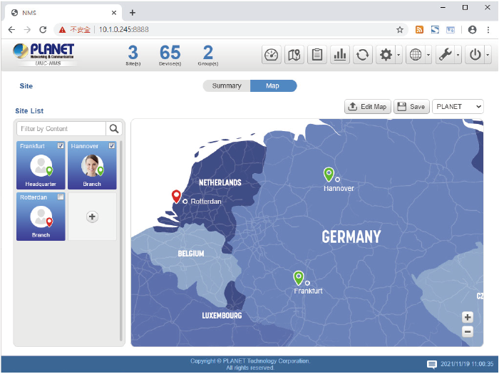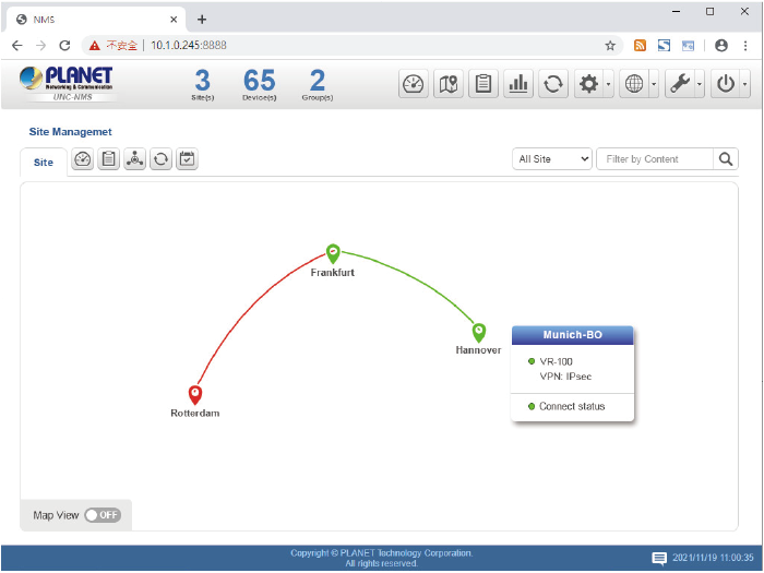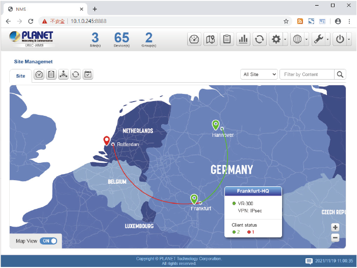 With the site maps, each site can be located according to the map, thus helping the administrator quickly overview the NMS agent and saving time and cost of on-site support and monitoring. The current statuses of NMS agents are shown in real time to optimize the site-to-site VPN network performance. The NMS Center Controller can provide up to 100 sites for all managed NMS agents.