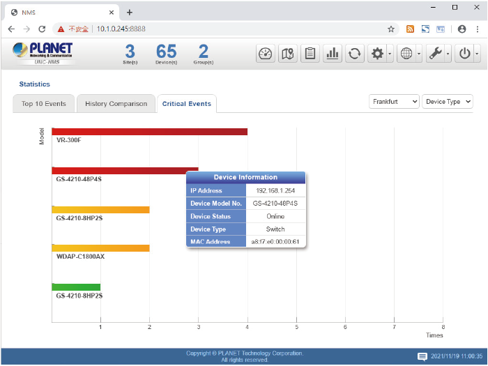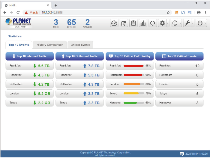 The NMS statistic page lists the top 10 inbound and outbound traffic, PoE health, and critical events. It can help administrator to analyze which device is having abnormal power consumption, abnormally high temperature, illegal time of usage, and the near end of life cycle in order to avoid network crash.