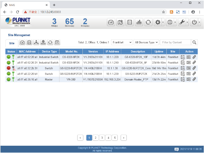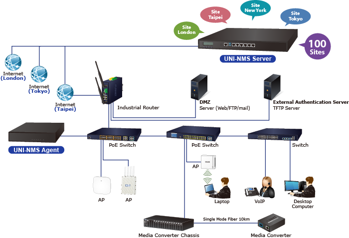 PLANET’s UNC-NMS Network Management Central Controllers can directly monitor 102,400 nodes by monitoring NMS-500 or NMS-1000V up to 100 sites. However, the deployed devices, such as managed switches, media converters, routers, smart APs, VoIP phones, IP cameras, etc., have to be compliant with the MQTT Protocol, SNMP Protocol, ONVIF Protocol and PLANET Smart Discovery utility. These enable the administrator to centrally manage these nodes from a central office, greatly boosting network and power management efficiency.