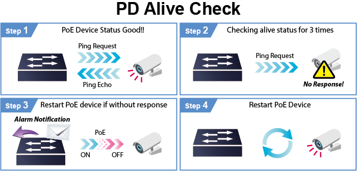 The UPOE-800XG can be configured to monitor connected PD status in real time via ping action. Once the PD stops working and responding, the UPOE-800XG will resume the PoE port power and bring the PD back to work. It will greatly enhance the network reliability through the PoE port resetting the PD’s power source and reducing administrator management burden.