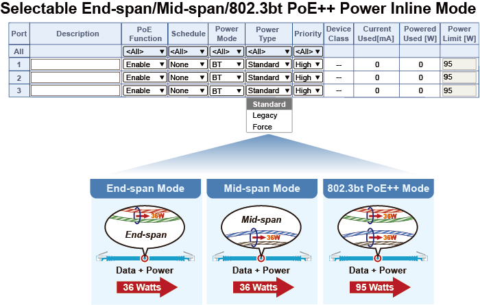 • 36W End-span 802.3at PoE+ Power Output Mode