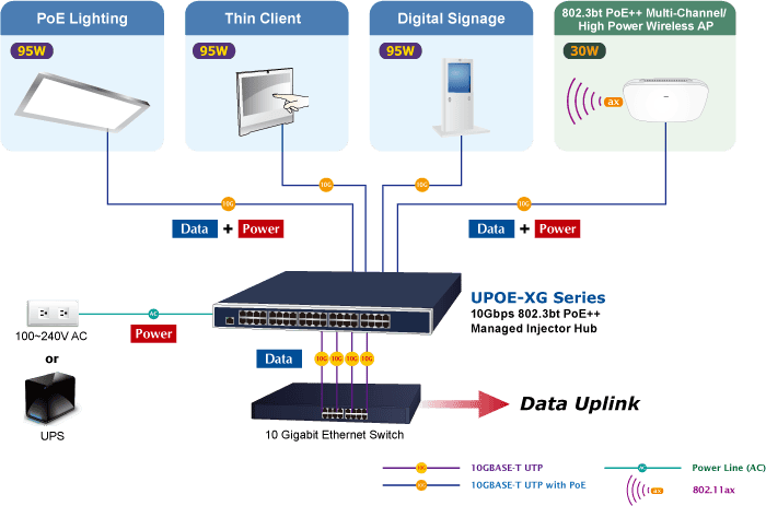 As the UPOE-800XG adopts the IEEE 802.bt PoE++ standard technology, it is capable to source up to 95 watts of power by using all the four pairs of standard Cat.5/5e/6/7 Ethernet cabling to deliver power and full-speed data to each remote PoE compliant powered device (PD). Its power capability is three times more than that of the conventional 802.3at PoE+ and it is an ideal solution for those high power consuming network PDs, such as: