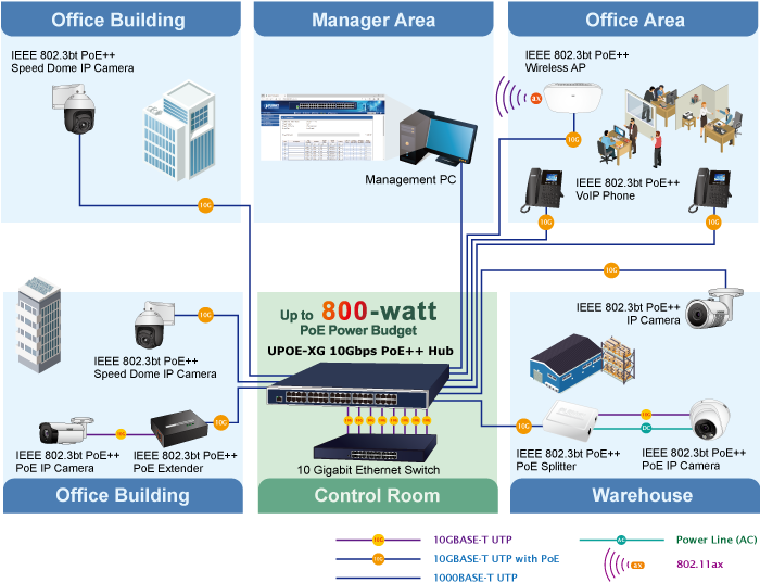 • applications_tab: <p><strong>Gigabit PoE++ Network Deployment</strong></p><p>The <strong>UPOE-800XG</strong> provides the easiest way to power your Ethernet devices such as IP camera on the ceiling and the wireless access point installed on the top of the building. With 8 10/100/1000/2.5G/5G/10GBASE-T Gigabit Ethernet ports, the <strong>UPOE-800XG</strong> supports full 54V DC power for any remote IEEE 802.3at/IEEE 802.3bt powered device (PD).</p><p>To control the power system of your networking devices, the <strong>UPOE-800XG</strong> can directly co-work with network devices such as PoE IP phone to build VoIP telephony network in the office. The <strong>UPOE-800XG</strong> can be directly connected to any third-party IEEE 802.3bt and 802.3at PoE compliant devices installed within 100 meters. Furthermore, the <strong>UPOE-800XG</strong> can extend much longer distance by using PLANET PoE Extender for powering up the PoE PD which can be installed over more than 100 meters away.</p><p> </p><p style="text-align: center;"><img src="https://www.planet.com.sa/planet-storage/2026/03/UPOE-XG-series-3.png" alt="" width="700" height="537"></p>