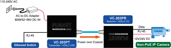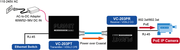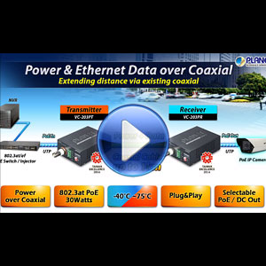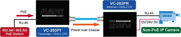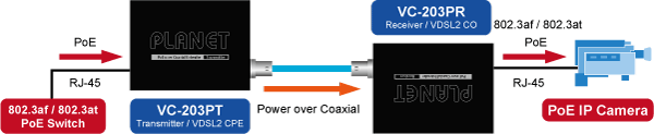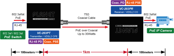 PLANET VC-203Px series of PoE over Coaxial Extender is designed to extend IP Ethernet transmission and inject power over an existing coaxial cable for distance up to 1000m (3280ft) to PoE IP camera, PoE Wireless AP and any 802.3af/at complied powered device (PD).