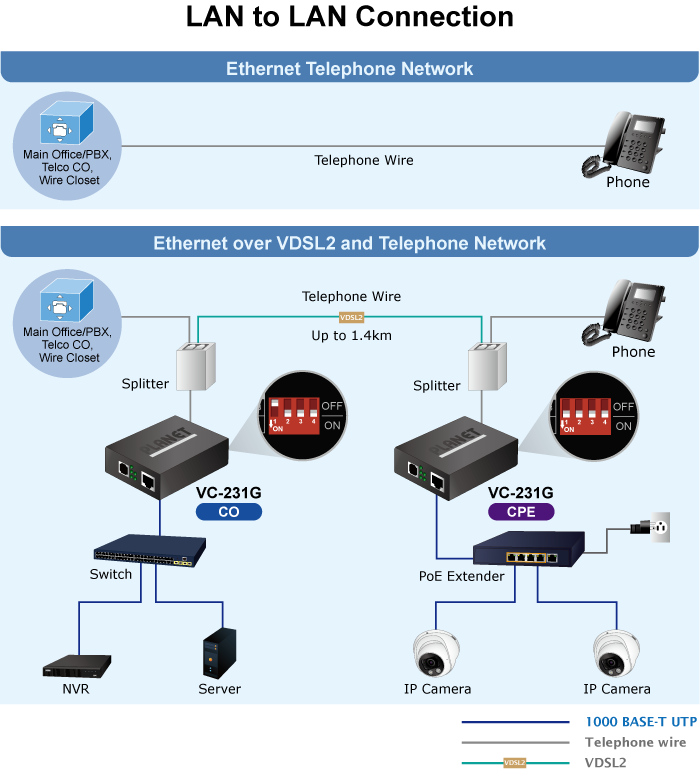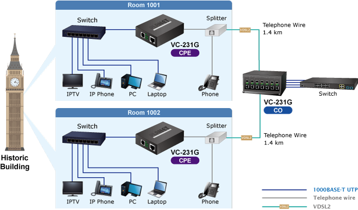 • product_editor_4418_tab_content: <strong>Ethernet Distance Extension</strong> Two VC-231G converters can act as a standalone pair which is good for Ethernet distance extension over the existing telephone wires. With just one pair of AWG-24 copper wires, two Ethernet networks can be easily connected to each other with a maximum data transmission rate of 200Mbps. The telephone service can still be used while the VC-231G CO/CPE is in operation. The two solutions listed below are typical applications for the Ethernet over VDSL2 bridge. <img style="display: block; margin-left: auto; margin-right: auto;" src="https://www.planet.com.sa/planet-storage/2025/01/VC-231Gv2-1.png" alt="" width="700" height="770" /> <strong>MTU/MDU/Hospitality Solution</strong> The VC-231G is a perfect solution to quickly providing cost-effective yet high-speed network services to multi-unit buildings such as residential buildings (multi-dwelling units), commercial (multi-tenant units) buildings, hotels and hospitals. By utilizing the existing telephony infrastructure, a new network installation can be easily built, without requiring new wiring. With a transmission rate of up to <strong>316/60Mbps (G.INP, Asym, 8dB)</strong>, VoD, IP telephony and various broadband services can be easily provided. <img style="display: block; margin-left: auto; margin-right: auto;" src="https://www.planet.com.sa/planet-storage/2025/01/VC-231Gv2-2.png" alt="" width="700" height="646" /> <strong>Last Mile of FTTx Deployment</strong> The VC-231G is an ideal solution for FTTx (Fiber to the Building, Fiber to the Campus or Fiber to the Node) applications.  It supports high-bandwidth VDSL2 over the existing telephone wires in the “<strong>last mile</strong>” from the ISP/telecom/service provider’s fiber node to the buildings and customers’ apartments. The 10/100/1000Mbps port of the VC-231G can be directly connected to a PC or Ethernet devices such as Ethernet switches or broadband routers. It is excellent for phone line network built under Internet because every room or house can use the existing phone line to transmit data through the Internet and the whole building can share the Internet to the wider area network at a minimum cost. <img style="display: block; margin-left: auto; margin-right: auto;" src="https://www.planet.com.sa/planet-storage/2025/01/VC-231Gv2-3.png" alt="" width="700" height="410" />