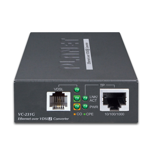 PLANET VC-231G, a new-generation and high-performance Gigabit Ethernet-over-VDSL2 Converter with the brand-new VDSL2 Super Vector 35b profile, works well with a pervasive telephone line network with a symmetric data rate of up to 200/200Mbps (G.INP, Sym, 8dB) over a distance of 200m and 21/13Mbps over a long distance of 1.4km. It is based on the two-core networking technology, Gigabit Ethernet and VDSL2 (Very-high-data-rate Digital Subscriber Line 2). The VDSL2 technology offers absolutely the fastest data transmission speed over the existing copper telephone lines without the need of rewiring.