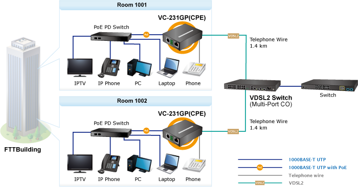 For point-to-point connection, the VC-231GP in the CPE mode and the VC-231G or VC-234G in the CO mode must be set up as one pair of converters to perform the connection. It gives administrators the ability to reply a fresh local Intranet in various locations by utilizing the original network structure without additional costs.