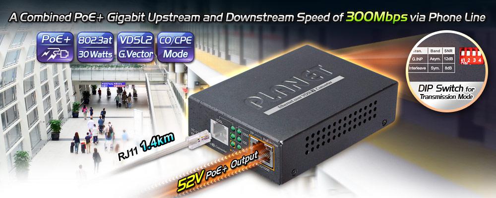 The VC-231GP, a PLANET Long Reach Ethernet (LRE) solution, is a Single-port Gigabit Ethernet-over-VDSL2 Converter with PoE injector function that is installed at a remote location connecting and injecting power to a PoE IP camera, PoE wireless AP, or PoE IP VoIP phone/door phone. It is integrated with three advanced technologies: