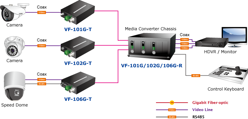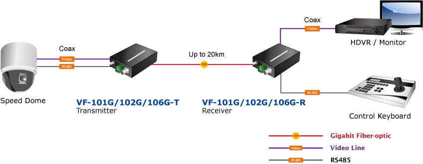 The VF-101G/102G/106G-KIT consists of 1 channel video over fiber optic transceiver and receiver to transmit video and RS485 signal through a reliable single mode or single fiber link. It is an ideal cost-effective solution for surveillance system that requires high display quality and high-performance signal transmission over long distances. The VF-101G/102G/106G-KIT can be installed easily by way of “Plug and Play”, meaning the operator does not need to configure the pair of the video over fiber transmission in advance.