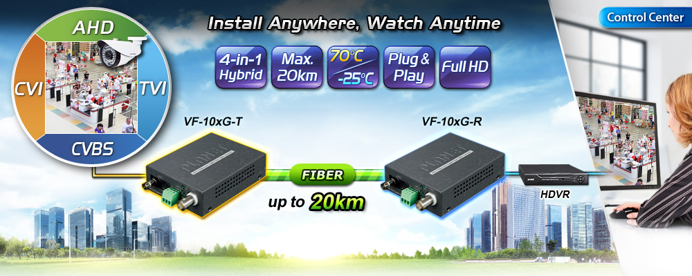 To deploy AHD/CVI/TVI/CVBS analog camera in a remote place efficiently and provide high video quality and reliable signal, PLANET has developed the video over Gigabit fiber media converter kit, VF-101G/102G/106G-KIT, which is ideal for extending the distance and signal conversion by transmitting the AHD/CVI/TVI/CVBS video and data over the fiber-optic cable. Adopting the intelligent encoding/decoding technology and with the compact box, the VF-101G/102G/106G-KIT video over fiber media converter enables videos to be delivered in high quality over a distance of up to 20km long.