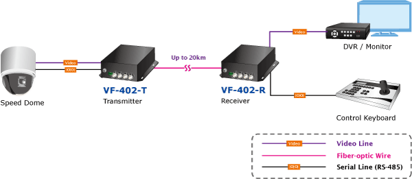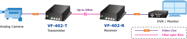 The VF-402-KIT consists of 4-channel video over fiber optical transceiver and receiver to transmit video and RS485 signal through a reliable single mode or single fiber link. It is an ideal cost-effective solution for surveillance system that requires high display quality and high-performance signal transmission over long distances. The VF-402-KIT can be installed easily by way of “Plug and Play”, meaning the operator does not need to configure the pair of the video over fiber transmission in advance.