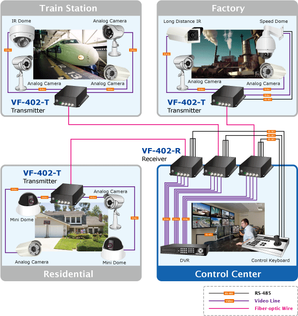 • The VF-402-KIT is a digital fiber-optic transmission system that brings users a cost-effective solution for transmission of 4-channel uncompressed digital video and one reverse RS485 async data over one single fiber cable. The VF-402-KIT is an adjustable free device providing high-quality and real-time video transmission. It can be widely used in intelligent transportation systems (ITS), traffic surveillance, security monitoring, automation control, intelligent residential districts, etc.