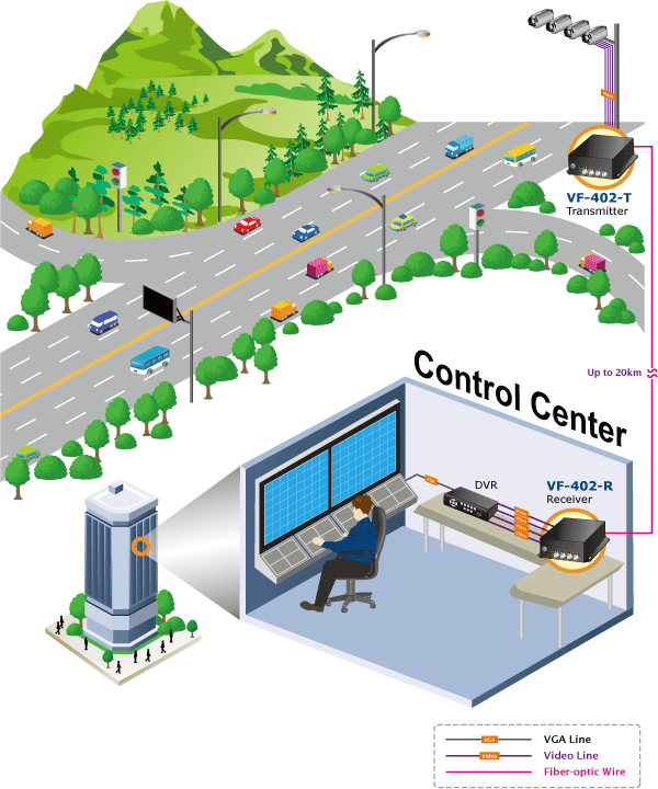 • applications_tab: <p>The VF-402-KIT consists of 4-channel video over fiber optical transceiver and receiver to transmit video and RS485 signal through a reliable single mode or single fiber link. It is an ideal cost-effective solution for surveillance system that requires high display quality and high-performance signal transmission over long distances. The VF-402-KIT can be installed easily by way of “Plug and Play”, meaning the operator does not need to configure the pair of the video over fiber transmission in advance.</p><p style="text-align: center;"><img class="img-fluid" src="https://www.planet.com.sa/planet-storage/2025/01/VF-402-KIT-3_L.gif"></p><p><strong>Typical Applications</strong></p><ul> <li>Intelligent Transportation Systems (ITS)</li> <li>Toll Collection</li> <li>Traffic Surveillance</li> <li>Air Traffic Management (ATM)</li> <li>Rail Signaling</li> <li>Perimeter Alarms and Area Monitoring</li> <li>Telemedicine and Teleconference</li> <li>Industrial Surveillance</li> <li>Intelligent Building</li> <li>CCTV Network</li> </ul><p> </p><p style="text-align: center;"> </p>