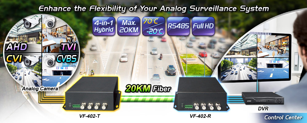 To deploy AHD/CVI/TVI/CVBS analog camera in a remote place efficiently and provide high video quality and reliable signal, PLANET has developed the video over fiber media converter kit, VF-402-KIT, which is ideal for extending the distance and signal conversion by transmitting the AHD/CVI/TVI/CVBS video and data over the fiber-optic cable. Adopting the intelligent encoding/decoding technology and with the compact box, the VF-402-KIT video over fiber media converter enables the videos to be delivered in high quality up to 20km long in distance.